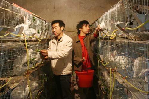 购兔种。今夏已从河南购进了首批种兔,精心科学饲养,目前已繁育了第二代良种。陈刚、陈祥介绍,每只母兔,每年可产崽5——8窝,每窝6——8只,1年可产40只左右。100多母兔,2011年可繁殖2000至3000只,2012年实现发展10000只的目标。獭兔全身是宝,每只兔肉、兔皮可收入100多元。