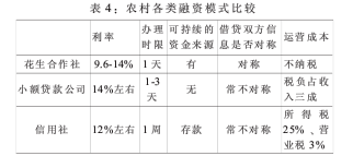 2.夏庄模式较小额贷款公司等新型金融组织具有较大优越性。我们以日照德胜小额贷款有限公司和日照市农村信用社为代表,把它们的信贷业务在利率、办理时限、资金来源以及运营成本与夏庄花生合作社的“金融互助”融资进行了简单的比较。从表4可以清晰地看出,花生合作社优势是多方面的,但最大的优势应是花生合作社融资是依托实体经济,在合作经济框架内的民间借贷行为,不是单纯的框架外放贷,解决了小额贷款公司、信用社存在的信息不对称问题,同时花生经营的商业可持续使其放贷有了后续资金。从制度上看,在信用社迈向商业金融的形势下,花生合作社模式作为农村合作金融、弱势金融方面的创新,有较大的市场空间、生命力。