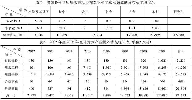 课题组在2007年的一次调查表明,在近10年的时间里,国家对调查区的10个村累计无偿投入资金900.3万元,带动烟区群众投资259.5万元(如表4所示)。