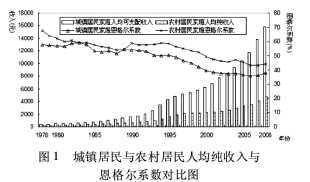 保障社会主义的根本目标是解放和发展生产力,消除两极分化,实现共同富裕。实现共同富裕,关键在农民收入的增加,近年来,中央相继出台了一系列重大的支农惠农政策:加大农业科技普及力度、实行工业返哺农业、取消农业特产税、良种直补等措施,但是,我国农民人均收入的增长幅度一直在6%左右,低于GDP和城市居民的收入增长幅度(如表1所示),而且收入绝对数与城市居民收入差距越来越大(如图1所示),政府每壹万元扶贫投入所能扶持的人数也呈明显的递减: