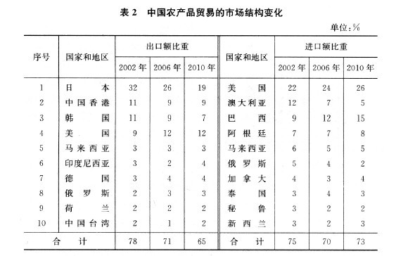 中国农产品贸易的地区结构比较显着,日本、韩国等亚洲国家是主要的农产品出口市场,美国、巴西、阿根廷等美洲国家则是主要的进口来源国。中国入世后,这样的贸易格局总体变化不大,但是出口集中度有所下降,进口地区更加集中。出口方面,日本是中国最大的出口市场,2002 年对日本的农产品出口额比重达到32%,显着高于其他市场,其次是中国香港和韩国,其比重都为11%,中国入世以来,这些出口市场的份额有所下降, 到2010 年,对日本的出口额比重仅为19%,中国香港和韩国的比重分别降为9%和7%.美国是中国农产品出口的另一个重要市场,2002 年的比重仅为9%,入世后比重显着增加, 2010 年达到12%,超过中国香港和韩国,成为中国农产品第二大出口地。此外,马来西亚和印度尼西亚也是中国农产品主要出口地,其比重不大,但相对较为稳定。进口方面,美国是中国农产品最大的进口来源国,并且进口额比重不断提高,2010 年比重达到26%,比2002 年增加4 个百分点,来自南美洲的巴西和阿根廷的进口额比重也在提高,特别是巴西,2010年进口额比重达到15%,比2002年增加6 个百分点,2010 年阿根廷的进口额比重上升到8%.这两个国家超过澳大利亚,成为中国农产品进口的第二大和第三大国家。因此,目前中国有一半以上的农产品进口来自美洲国家。见表2.