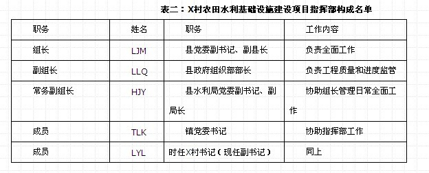 在项目工程监管过程中,县相关职能部门成立“工程指挥部”,指挥部成员由县、乡、村三级构成,县级主要负责人,乡村两级主要由“一把手”(一般是书记)。下面是X村农田水利基础设施建设项目指挥部成员名单: