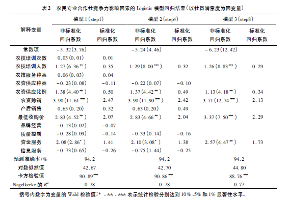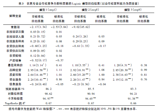 以社员对合作社提供服务的满意度和合作社营利能力为因变量,本文用SPSS16. 0 统计软件对138 家样本合作社的横截面数据分别进行了Logistic回归处理。在处理过程中,我们采用了Backward conditional 方法。首先将所有变量全部引入回归方程,然后进行回归系数显着性检验,将显着性水平不好的变量逐个剔除,然后重新拟合回归方程,并进行检验,直到方程中变量回归系数基本显着为止。因此本文中的step 指的是由刚开始显着性水平不好的变量慢慢被剔除,直到最后回归系数基本显着为止,即从step1 到step8( 以社员满意度为因变量的最后一步是step8) 和从step1 到step9( 以合作社营利能力为因变量的最后一步是step9) .从各种模型的运行情况来看,模型整体检验基本可以,不同统计模型的估计结果和结论也基本相似,估计结果比较稳定。由于用SPSS 进行Logistic 回归分析,不能提供标准化的回归系数,给自变量相对作用的比较带来了不便,本文已把各个变量的非标准化回归系数转换为标准化回归系数。为了减少篇幅,本文只分别列出计量估计结果中的3 种( 表2、表3) .根据模型计量结果,我们将影响农民专业合作社竞争力的价值链环节、显着性和影响程度归纳如下:
