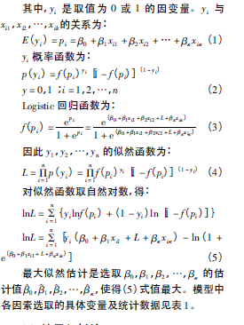 传统的回归模型由于因变量的取值范围为( - ∞,+ ∞) ,在此处不适用。本文采用二元Lo Logistic回归分析模型,将因变量取值限制在( 0,1)范围内,并通过最大似然估计法对其回归参数进行估计。设x1,x2,…xk,xk是与y 相关的自变量,一共有n 组观测数据,即: xi1,xi2,…,x ik; yi; i = 1,2,3,…,n.