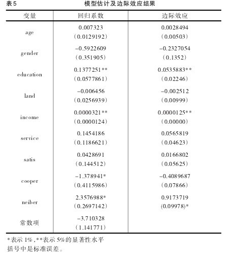 运用stata对上述方程进行回归,并计算相应的边际效应,就可以得到如下的估计结果(见表5)。
