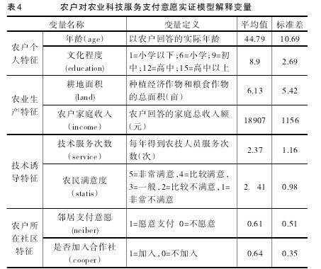 笔者认为,在农户做出支付意愿的决策过程中,农户的个人特征和农业生产特征应是重要的影响变量。一般来说,农户收入水平越高,支付能力越强。农户年龄越低,越容易接受新鲜事物,他们在从事农业生产中也希望接受新的种植技术与生产技术,从而愿意为农业科技服务支付费用。同时,农户的受教育程度越高,越容易认同并接受农业科技,从而支付意愿也比较强烈。