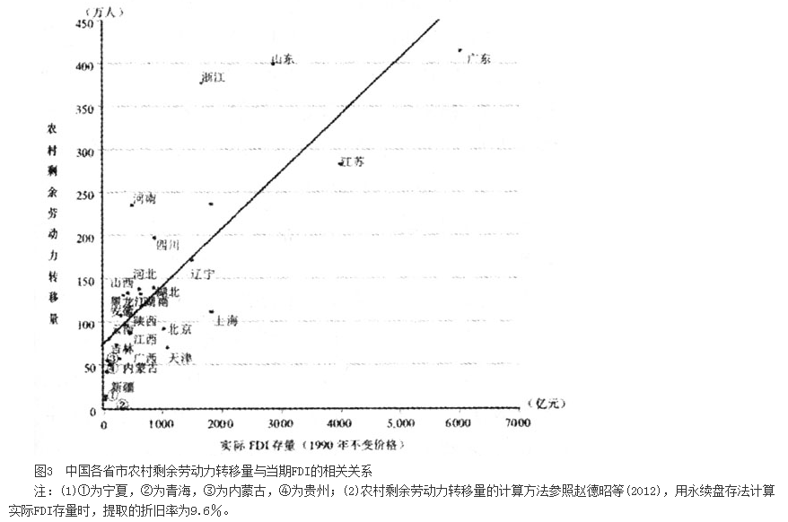 劳动密集型FDI产业在东部地区的集聚极大推动了农村剩余劳动力的跨区域流动,FDI因而成为吸纳农村剩余劳动力转移就业的主要力量(杨云彦,2003)。从图3中可以看出,各省市农村剩余劳动力转移量与当期实际FDI存量存在显著的正相关关系,说明FDI对农村剩余劳动力转移有较强的促进作用。未来相当长的一段时间内,农村剩余劳动力的跨区域流动必将与FDI产业的空间集聚紧密联系在一起,但其对农村剩余劳动力转移的影响效应存在明显的“梯度差异”。具体表现在,广东、山东、浙江、江苏和福建成为农村剩余劳动力转移量较多的五个省份,究其原因在于上述省份均处在地理位置优越、交通便利的东部沿海地区,开放程度高和国家早期经济发展重心的倾斜使其吸引了大量FDI,众多外资企业在当地投资建厂有效促进了农村剩余劳动力向城市的转移就业。但是,从全国范围内来看,各省市农村剩余劳动力转移量普遍较小(集中在0~200万人/年的区间内),所以农村剩余劳动力转移就业的任务仍然较为艰巨。在制度变革短期内作用有限的情况下,有效利用FDI促进农村剩余劳动力的转移就业成为中国现阶段极具现实意义和政策涵义的重大课题。