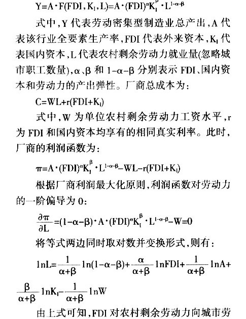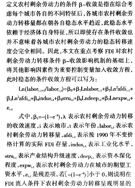 本文其余部分的结构安排如下:第二部分是FDI流入对农村剩余劳动力转移收敛性的影响机制;第三部分是计量模型建立和数据来源说明;第四部分是针对中国城市数据的经验研究;最后是研究结论及政策启示。