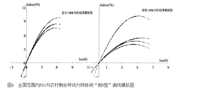 随着FDI的持续流入,外资企业之间、外资与内资企业之间的竞争日益加剧,加之中国经济转型对产业结构升级的现实需要,均将迫使大量FDI选择资本技术密集型产业进行投资。由于资本技术密集型企业对劳动力技术水平的要求相对较高,但中国目前积压在农村的大部分是非熟练劳动力,往往缺乏足够的生产技能或面临职业身份转换障碍,产业升级在很大程度上将形成资本技术对低素质劳动力的“就业挤出”效应,这将对农村剩余劳动力转移产生不利影响(图4中“倒U型”曲线的右半部分)。但此时,受制于劳动力、土地等要素价格上升以及产业结构升级的需要,初始FDI流入量较大的发达城市逐步将劳动密集型FDI产业向欠发达城市转移,这极大促进了欠发达城市农村剩余劳动力转移的速度。在FDI产业进行“梯度转移”的过程中,城市间劳动力要素配置差异和劳动力市场发展的不平衡性将逐步消除,全国范围内农村剩余劳动力转移呈现显著的条件β-收敛特征。
