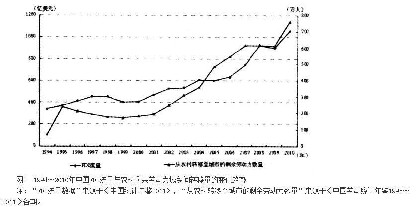 在二元经济格局下,中国劳动力市场正面临着双重甚至多重分割。作为资源重新配置的重要方式,城乡之间的劳动力流动主要表现为非城镇户籍人口向城镇地区的空间转换,城乡分割的二元结构最终演变为“城乡统筹”的一元结构。本文以“各地区城镇单位就业人员增加来源”中“从农村招收人数”作为“农村剩余劳动力城乡间转移量”的替代指标。20世纪90年代以来,FDI产业在城市的大量集聚吸引了大批农村剩余劳动力向城市的转移就业。从图2中可以看出,1994年后从农村转移至城市的农村剩余劳动力数量飞速增长,这不仅在于国家首次从法规上确认了农村剩余劳动力流向城市转移就业的合法性,②更为重要的原因在于FDI的大量流入。1997~1999年,受亚洲金融风暴的影响,中国FDI流入量增长缓慢甚至出现了负增长,而农村剩余劳动力转移数量也随之大幅下降。同时,城市严重的失业问题也迫使政府加强了对城乡迁移的控制。②2001~2007年间,FDI流入量和农村剩余劳动力城乡迁移量均出现大幅增长。2008~2009年,受美国次贷危机影响,FDI流入量和农村剩余劳动力城乡间的迁移量均出现一定程度的下降,但2010年FDI流入量和农村剩余劳动力向城市转移量均出现了大幅回升。总体而言,农村剩余劳动力在城乡间的迁移总是与FDI的流入紧密结合在一起,FDI已是推动中国城乡统筹发展不可忽视的重要力量。