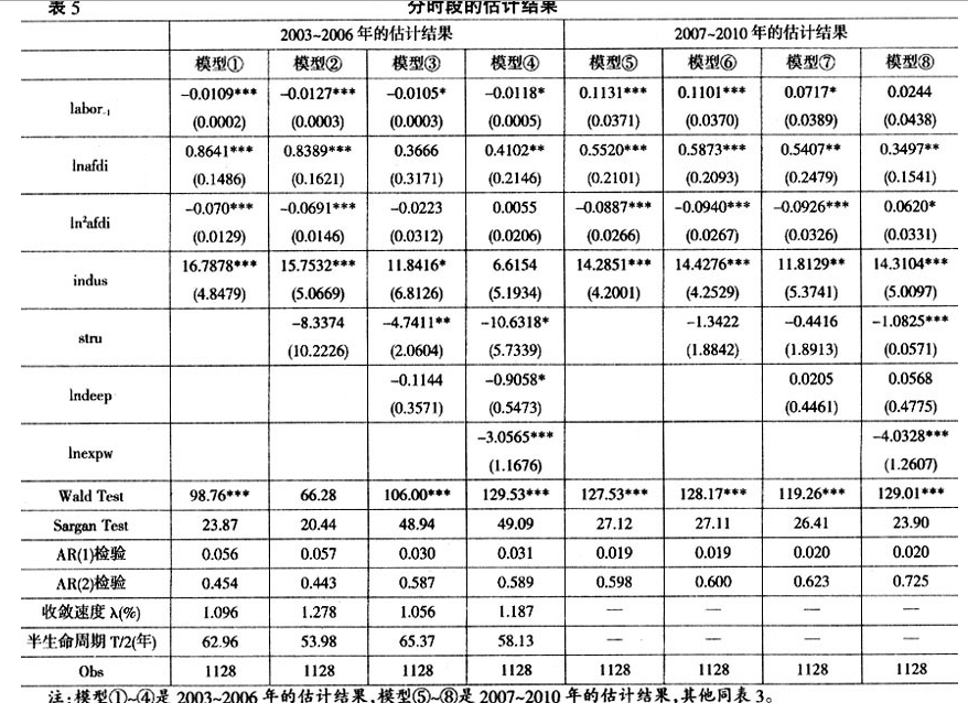 其他控制变量影响的分析。工业化水平(indus)的提升对农村剩余劳动力转移具有持续稳健的正向促进作用,这与前文的理论预期和研究结果相一致,在此不再做详细阐释。产业结构升级(stru)对农村剩余劳动力就业的“置换效应”随时间推移而显著降低,这主要是因为,一方面农村剩余劳动力通过职业培训、岗前培训等途径使自身人力资本与资本技术密集型产业的匹配度大幅提高,在一定程度上降低了自身就业难度;另一方面,虽然FDI可能通过竞争、示范和产业关联等方式对内资制造业产生正向技术外溢和带动其产业结构升级(陈继勇等,2009;周申等,2012),从而形成对农村剩余劳动力的“就业挤出”效应,但FDI的正向技术外溢也极大提升了制造业在世界市场上的比较优势和总体竞争力,从而引起制造业出口规模扩大和劳动力需求的增加,在一定程度上抵消了产业结构升级对就业的负向影响。资本深化程度(deep)方面,2003~2006年其对农村剩余劳动力转移具有显著的负向影响,2007~2010年其与农村剩余劳动力转移呈现同方向的变化趋势(系数并不显著),这与产业结构升级的影响机制较为相似。农村剩余劳动力期望工资水平(expw)的提高反而极大降低了农村剩余劳动力向城市转移就业的速度,且此效应随着地方政府陆续提高“最低工资标准”而得到不断强化。究其原因在于,“最低工资标准”制度极大提高了企业的用工成本,迫使劳动密集型FDI企业转移至劳动力成本更为低廉的越南、老挝等国家,这使得中国在仍具有大量农村剩余劳动力需要转移时却已丧失劳动力比较优势,这将对农村剩余劳动力的持续转移产生不利影响。而且,若农村剩余劳动力期望工资水平上升幅度超过了其劳动生产率的增加速度,则企业具有更大的倾向使用资本技术替代劳动力。