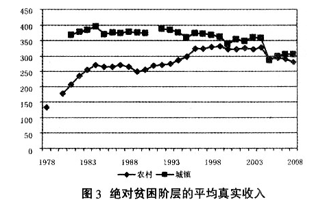 从图3可以看出,1978年以来,城镇绝对贫困阶层的家庭人均年收入基本上没有上升,这是与中国改革以来经济总量高速增长的现实高度不协调的。这意味着,尽管改革以来中国绝对贫困率迅速下降,但绝对贫困阶层中最低收入群体的真实收入水平没有获得任何提高。这恰恰印证了阿马蒂亚·森对以贫困率描述贫困状况所担心的一个问题:政府部门为了以最快方式降低贫困率,就会把有限的扶贫资金全部投入到贫困线附近的贫困人口中,而不会顾及贫困人口内部的收入分布状况。这样,那些远低于贫困线的人口的极度贫困状况就很难得到改善,而他们恰恰是更需要帮助的群体。