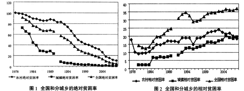 本文利用收入分组数据拟合出收入分布函数,再根据世界银行推荐的绝对贫困标准和经合组织制定的相对贫困标准,系统地计算了1978~2008年的绝对贫困线、绝对贫困率、相对贫困线、相对贫困率,并分析了这些贫困状况指标的演变过程与中国经济体制改革进程的关系,总的结论是:绝对贫困率在这段时期内迅速下降,但直到目前为止,仍然没有完全摆脱绝对贫困状况,这是与中国在这段时期内的持续高速增长是不合拍的,原因在于高速增长的同时伴随着收入差距的急剧扩大,以至于经济增长的收益没有惠及极低收入群体;城镇绝对贫困阶层的平均收入几乎从来没有提高,农村绝对贫困阶层的平均收入也只是阶段性的提高,1996年以后几乎没有变化,这也是与经济总量高速增长的事实不协调的;相对贫困率在这段时期内则持续上升,这也是由于收入差距持续扩大造成的,因为收入差距扩大意味着富人占有更多的收入,而这必然以更多的穷人陷入被相对剥夺的境地为代价,这就可能导致相对贫困率上升。