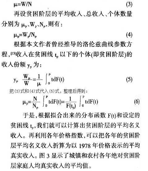 为了进一步了解贫困阶层的收入水平及其变化过程,我们利用上述拟合出来的收入分布函数,计算了绝对贫困阶层的真实平均收入,具体过程如下。