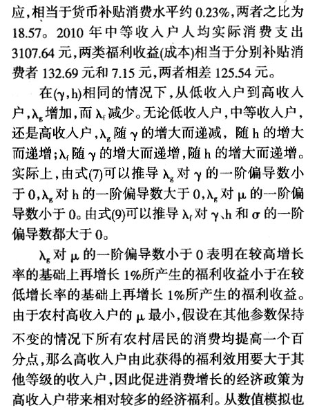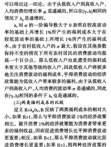 本文将消费习惯引入Lucas(1987)模型,采用农村五等份收入户的消费数据进行数值模拟发现:在绝大多数情形,两类福利成本之比R大于1,促进消费增长1%引起的福利效应大于平抑消费波动1%引起的福利效应,这表明消费增长比消费平稳更为重要;收入等级越高,消费增长比消费平稳就越重要。当相对风险规避系数γ一定时,两类福利成本之比R随习惯强度h的增大而呈“倒U”型;当γ较小时其左半部分较短,γ居中时左右大致对称,γ接近20时右半部分则变得较短。当习惯强度h一定时,两类福利成本之比R随相对风险规避系数γ的增大而递减;h越大,两类福利成本之比R随γ变化的轨迹就越平坦。此外,促进消费增长的经济政策为高收入户带来相对较多的福利,而平抑消费波动的经济政策能为低收入户带来较多的福利。