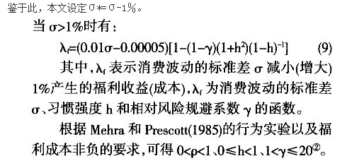 在国内,陈彦斌(2005)通过修正Lucas(1987)模型和数值模拟发现,对于合意的偏好参数及中国的宏观经济数据,这两种福利成本大致相当,从而断言Lucas(1987)的结论不适用于中国[2]。饶晓辉、廖进球(2008)采用递归效用函数形式研究发现,当相对风险规避系数和跨期替代弹性参数取合意数值时,中国经济周期的福利成本与经济增长的福利收益接近[3]。然而,饶晓辉、廖进球(2008)则认为,改革前的经济波动不是很重要;但从改革后或整个样本区间(1952-2004)看,中国经济额外增长1%的福利收益小于经济波动的福利成本。这意味着宏观经济波动对中国有着重要意义,中国政府应在保持经济增长的同时,更应关注经济的平稳性[4]。李凌、王翔(2010)使用中国城镇居民的消费数据分析发现,相对于抑制消费波动,促进消费增长更为重要[5]。陈太明(2013)认为在重视长期经济增长的同时不能草率否定短期经济稳定的重要性[6]。由于以往研究的结论不一致,所以此类研究有待拓展。
