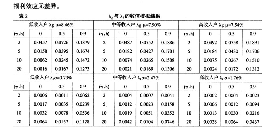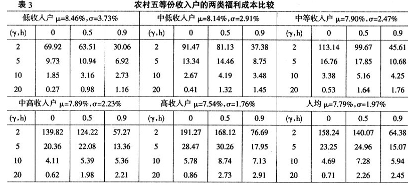 由表3可以看出,考虑消费习惯之后,两类福利成本之比低于200,比Lucas(1987)所声称的2500倍小许多。在(γ,h)相同的情况下,从低到高五种收入户的R递增,高收入户的两类福利成本之比为低收入户的近3倍,表明促进消费增长的政策会给高收入者带来更多的福利,究其原因,高收入者拥有较多的资本和财富,在消费增长中获益较多,而低收入者应对消费波动的能力脆弱。相对于高收入者,平抑消费波动会给低收入者带来较多的福利。