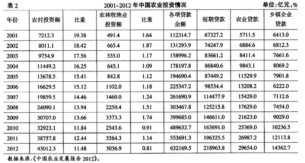 3.政府支持力度不足。中国法律体系不健全,加上制度约束,无法使农业从外部获得稳定的融资保障,而且中国财政对农业的投入总量太低,农村融资得不到政府财政足够的支持。从新中国成立至今,中国每年对农业的投资总量不及美国的1/20,也远低于多数WTO成员5%~20%的水平。2001-2012年,中国社会固定资产投资中,尽管农村投资额由7 212.3亿元上升到43 012.3亿元,但占社会固定资产投资总额的比重却从19.38%一路下滑到11.48%;城镇固定资产投资中,农林牧渔业的投资比重从1.64%下降到0.81%,波动极大(表2)。说明中国政府对农村金融的支持力度不足,政府财政投资在农业融资体系中发挥的作用很小。
