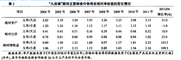 从前面的分析可以看出,过去9年粮食作物内部种植结构调整主要体现为玉米对小麦、大豆及其他粮食作物的替代。玉米播种面积不断增加的主要原因正在于玉米每亩相对净收益逐年走高(见表5)。2004-2011年,玉米与大豆的相对单产由2.82倍提高至3.13倍,增加31%,相对比价由41%上升至52%,上涨10.9%,总收益增长了将近50%;尽管玉米与小麦的相对单产基本保持不变,但相对价格却上升了23.9%,总收益的增长大体相同。“九连增”期间相对单产和相对比价的变化对玉米有利,玉米亩均相对净收益呈不断上涨态势。考虑到三种作物之间存在一定的直接争地关系,玉米亩均相对净收益的上升将引导农户扩大玉米的播种面积而缩减小麦及大豆的播种比例。