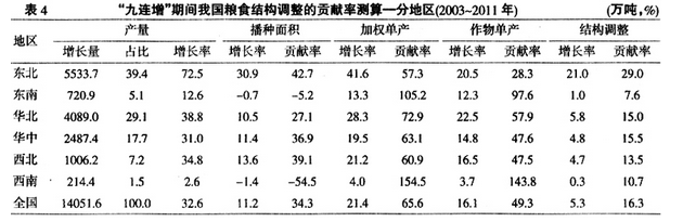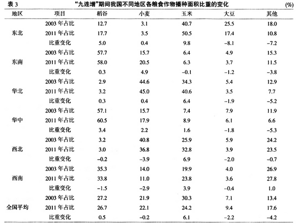 2.结构调整对粮食“九连增”的贡献——分地区。分区域来看,“九连增”期间全国不同地区粮食作物内部种植结构调整,即高产作物对低产作物的种植替代在替代方式和替代程度上存在较为明显的差异(见表3)。与全国整体的结构调整形式相似,东北、华北地区粮食作物内部种植结构调整主要体现为高产的稻谷、玉米对低产的大豆和其他粮食作物的替代,小麦播种比例较为稳定。其中,东北地区这种替代关系最为明显:2003-2011年,东北玉米和稻谷播种面积占粮食总播种面积的比重分别提高了9.8和5.0个百分点,各自比全国平均水平高出3.7和4.5个百分点,而同期大豆和其他粮食作物的播种比例累计减少8.1和7.2个百分点,显著高于全国的平均降幅。考虑到东北、华北地区在全国粮食生产和增产中的特殊地位②,这两个区域内的这种稻谷、玉米对大豆和其他粮食作物大幅度的种植替代无疑将对全国整体的结构调整走势产生十分重要的影响。