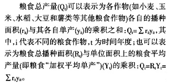 )的乘积。前者的变化往往源于技术进步(以及要素投入量和当年的天气等),而后者的变化就是粮食作物内部的种植结构调整。如果种植结构不变,各作物单产的提高无疑会提高加权平均单产;而如果种植结构调整(如加大高产作物的种植比重),则即使各作物的单产没有任何提高(甚至有一定程度的下降),加权平均单产仍有可能上升,在总播种面积不变的情况下增加总产量。