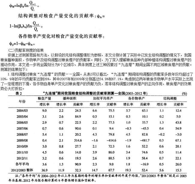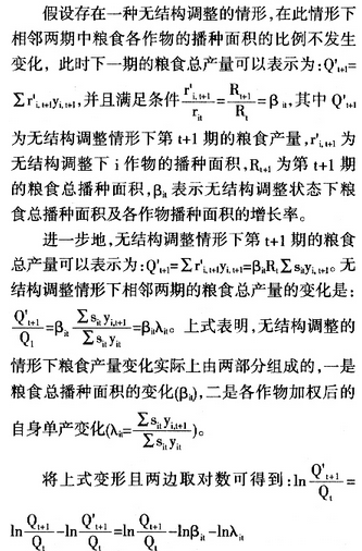 这表明,从实际的、可观察到的粮食产量变化中扣除因粮食总播种面积和各粮食作物自身单产变化所导致的粮食总产量变化部分,即可得到因结构调整而导致的粮食产量的变化率。