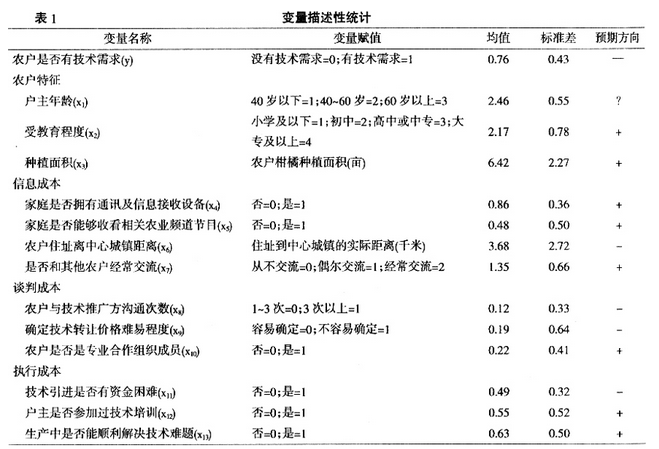 本文将影响农户农业技术需求的自变量确定为农户特征、信息成本、谈判成本、执行成本共四类。其中,对每一类分别选取若干具体可测度的因素作为自变量。各个变量的含义、描述性统计分析结果及其对因变量的预期影响方向如表1所示。