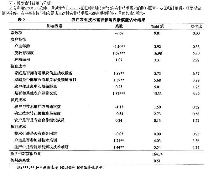 本文利用柑橘主产区的实地调查数据,借鉴前人的理论研究与经验研究成果,通过Logistic模型分析了交易成本对农户农业技术需求的影响。分析结果表明: