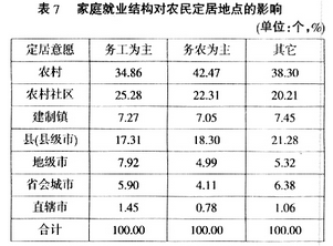 以务工为主业的农民家庭对农村的依赖性小,因而最希望离开农村进入城镇。调查表明,只有34.86%的务工农民愿意留在农村,这比务农农民42.47%的比例少了8个百分点。与之相比,务工农民更愿意进入社区,其选择农村社区作为理想定居地点的比重为25.28%,高于务农农民22.31%的比例,说明农村社区得到了务工农民更多的亲睐。在城镇定居意愿上,务工农民希望进入城镇的比重为39.86%,要高于务农农民35.22%的比重(见表7)。可见,改变农民家庭就业结构对于农民定居城镇至关重要。只有当农民对农村和农业的依赖逐步减小之后,他们才更愿意离开农村进入城镇定居。