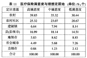 农村社会保障水平的不足是促使农民希望进入城镇定居的重要原因。通过考察农民对“新农合”满意度与理想定居地的关系我们发现,对“新农合”满意度由高到低的农民选择定居农村的比率依次为39.85%、35.32%、30.44%,呈逐渐降低的趋势。也就是说,对“新农合”满意度越低的农民,其离开农村的意愿越强。另外,对“新农合”满意度低的农民选择定居建制镇(8.14%)、地级市(8.85%)、省会城市(7.26%)和直辖市(2.12%)的比率均比其他满意度水平的农民更高(见表11)。可见,对“新农合”满意度越低,农民定居城镇的意愿越强。产生这一现象的原因,主要在于目前的“新农合”政策尚不能满足农民对医疗服务的需求,农民希望到城镇定居,享受更高水平的医疗保障。