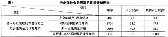 新型农村养老保险制度具有极高的关注度,但对实施效果的评价,65%的被调查者认为效果较小或无效果。主要原因从调查表5看出,不能满足开销者占五成多。养老保险金数额较低,不能满足老人日常开销是效果评价较低的原因。