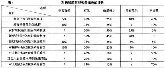 在调查中还发现,被调查者对政策和服务的有效性评价跟其自身贫困程度有一定关系。如评价“家电下乡”政策,在经济状况相对较好的息烽县,60%被调查者认为该政策有效,13%的补贴率减轻了农民购买家电的经济负担,让农民真正享有实惠。而在贫困程度较深的地区,人们更多关注温饱问题,家电消费较少,因而对家电下乡效果评价不佳。