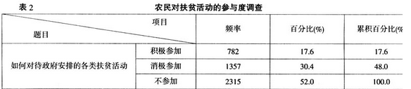 4.扶贫项目多属短期项目,不能有效帮助农民脱贫。扶贫项目大多数为“以工代赈”等短期扶贫项目。参与扶贫项目主要是退耕还林、农业生产、公路建设、电力设施建设,项目建设期间收入水平有所提高,项目结束又重新陷于贫困。得到过贫困救助的比例也处于较低水平,救助对象主要是老年人,救助来源主要是政府贫困补助、政府提供的低保金。因此,部分人对政府的扶贫活动参与不够积极,另一些人则因外出务工无法参与、不知道等原因未参与政府安排的扶贫活动。但部分人对于政府帮助农民脱贫充满了信心,积极主动参与各类扶贫活动。对政府扶贫活动的参与度如下表所示: