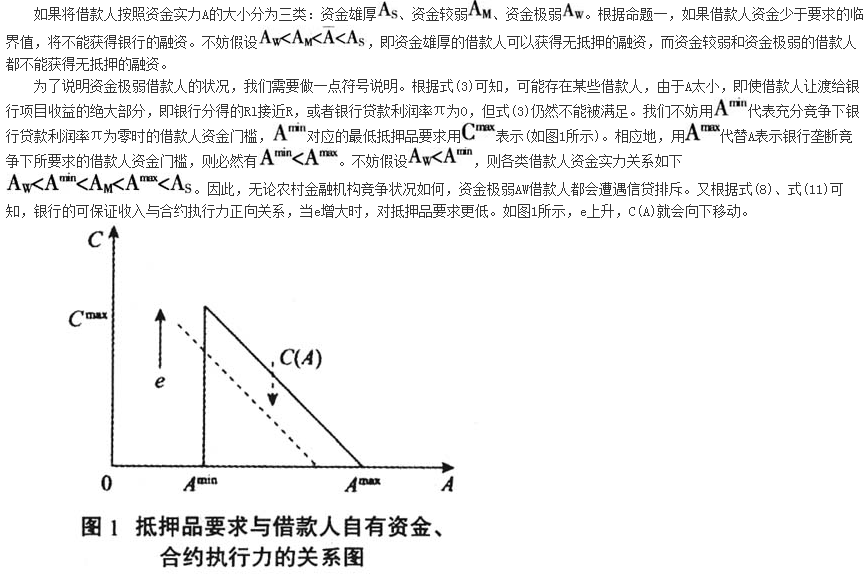 图1显示,提升合约执行力可以使资金较薄弱的借款人成为最大获益者。因为,资金实力雄厚的借款人AS,获得融资不需要抵押或只需要很少的抵押,融资条件很容易满足,提升合约执行力并不会带给实力雄厚借款人太多益处;而对于资金非常弱的借款人,允许农地抵押,即使合约执行力提升后,例如e=1,因为自有资金极低,仍然需要较高的抵押品门槛,难以改变信贷被配给的命运。所以,对实力雄厚和资金很薄弱的两类借款人,提升合约执行力并不会改变(或改善)其融资状况。