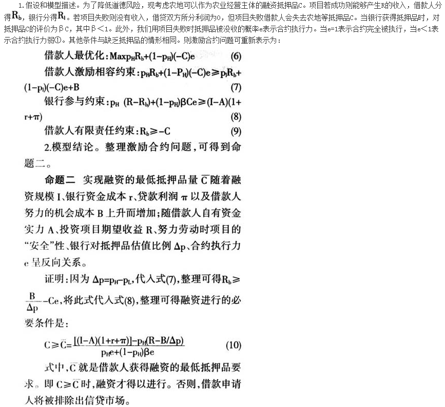 本文拟从金融交易中的道德风险出发,运用合约理论剖析我国农地抵押信贷供给效应的制约因素,解释农地抵押融资试验困境发生的经济原因,揭示农地抵押融资受益主体特征,从而阐明农地抵押融资对于新型经营主体的意义,弥补既有研究在这方面的缺陷。