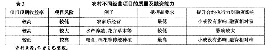 项目质量的高低可以用预期收益率和风险来度量。根据理性和风险厌恶的假设,项目预期收益率越高,风险越小(或安全性越高),则项目质量越高,根据式(10)可知抵押品要求就越低。根据项目质量可以将农村(或农业)经营主体经营项目分成三类,详见表3。如农家乐经营,附加值高,主要面临市场风险,已经没有了农业风险,因此属于较高收益、较低风险的项目;对于水产养殖、花卉草木等经济作物附加值也较高,但这些项目同时面临着农业风险和市场风险,因此属于较高收益、较大风险项目;传统种植业如粮食、棉花,附加值低于其他经济作物,而双重风险依然很大,相比之下属于较低收益、较高风险。第一类项目抵押品要求最低,即使合约处于较弱实施水平,融资条件也最容易满足;第二类项目抵押品要求有所提高,金融机构选择性放贷,合约执行力提升会改善融资;第三类项目抵押品要求最高,即便合约执行力提升,相当部分经营主体仍然可能遭遇金融机构信贷配给。因此,加大对传统种植业的农业保险和财政补贴扶持力度,降低其经营风险,增加经营收益,对于改善这部分经营主体的融资能力非常必要。