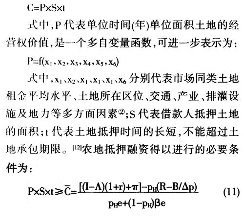 由于我国农村土地集体所有,农民只享有承包土地的经营权。农民失地、耕地流失等风险是现行《担保法》和《物权法》禁止农地抵押的主要顾虑。因此,目前农地抵押标的物只能是农地经营权,而非所有权和承包权。影响农地经营权价值C的因素至少包括三个方面: