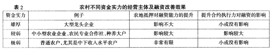 对于资金实力雄厚的大型农业企业,其融资能力原本就强,农地抵押与否对其没有影响或影响有限。而单个小规模农户也不会因为农地抵押而大幅度改善融资能力,尤其是资金极弱的较贫困农户,允许农地抵押和提升合约执行力,都难以改变其被信贷排斥的命运。