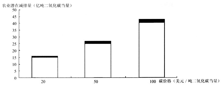 注:图中两种颜色表示不同碳价格情境下农业减排量的范围,譬如,碳价为20美元/吨二氧化碳当量,农业能够减排15亿~16亿吨二氧化碳当量。