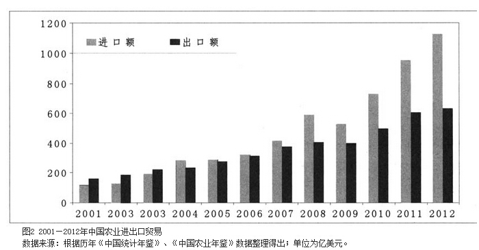 首先,我国主要农产品的供求持续紧平衡状态,部分农产品结构性短缺凸显。主要表现在以下几个方面:一是粮食自给率下降。在粮食供给方面,尽管我国粮食连年增产,实现了十连增,但由于需求的刚性增长,粮食自给率明显下降,已从20世纪90年代的99.6%(农业部软科学课题组,2001),下降到2010年的90%左右,2010年我国大豆进口5480万吨,接近11000亿斤,中国把大豆算作粮食,从这个角度看我国进口的粮食差不多相当于国产粮食的10%,也就等于过去承诺的粮食的自给率不低于95%的线实际上已经被突破了,突破了过去承诺的不低于95%的底线。2000年以来,我国粮食基本处于净进口状态,2013年,中国谷物约净进口1358.4万吨,增长4.8%。2004年是我国农产品国际贸易的转折点,农产品贸易由顺差创汇阶段进入逆差状态,此后连续9年我国农产品进出口一直处于贸易逆差状态(如图2),并呈现出逆差扩大趋势。二是部分农产品结构性短缺凸显。大豆在90年代后期开始净进口,并且大豆进口量在逐年递增,2013年净进口达到6337.5万吨,同比增长8.5%。在棉花供给方面,我国自2002年入世后,棉纺制品出口量剧增,国内棉花生产供不应求,棉花进口量大幅增加。2001年我国成为棉花净进口国,2003年成为世界第一大棉花进口国,2004年以后,棉花进口量更是大幅度增长,2013年达到450.0万吨。