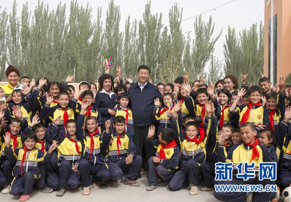 今年4月28日,习近平在喀什地区的疏附县托克扎克镇中心小学同师生们合影。新华社记者 谢环驰 摄