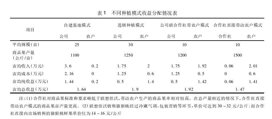 模式方面,从我们对联想佳沃的调研结果来看,种植农户、家庭农场、农民合作社和龙头企业等经营主体在猕猴桃产业链不同环节都有各自的优势和定位。从收益上看,自建基地、连锁种植、公司联合作社带农户三种模式的亩均收入和亩均纯收益( 农户、公司收益之和) 均高于合作社直接带动农户模式。这显示了联想佳沃的品牌价值和市场开发能力,提高了猕猴桃产业发展的总体收益,这也是工商资本进入农业的积极意义。